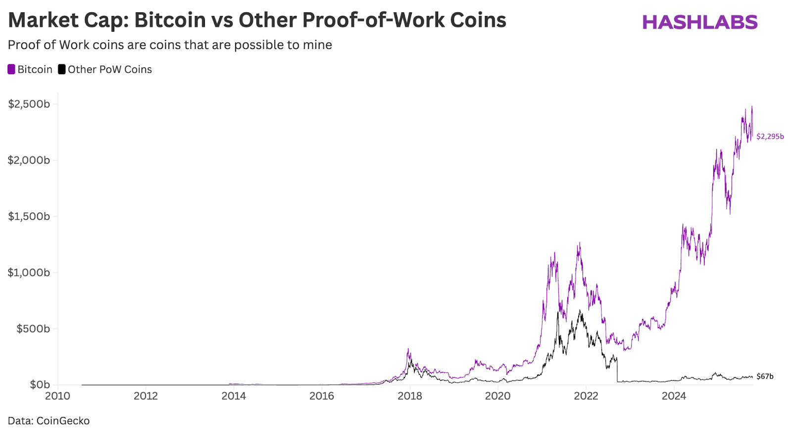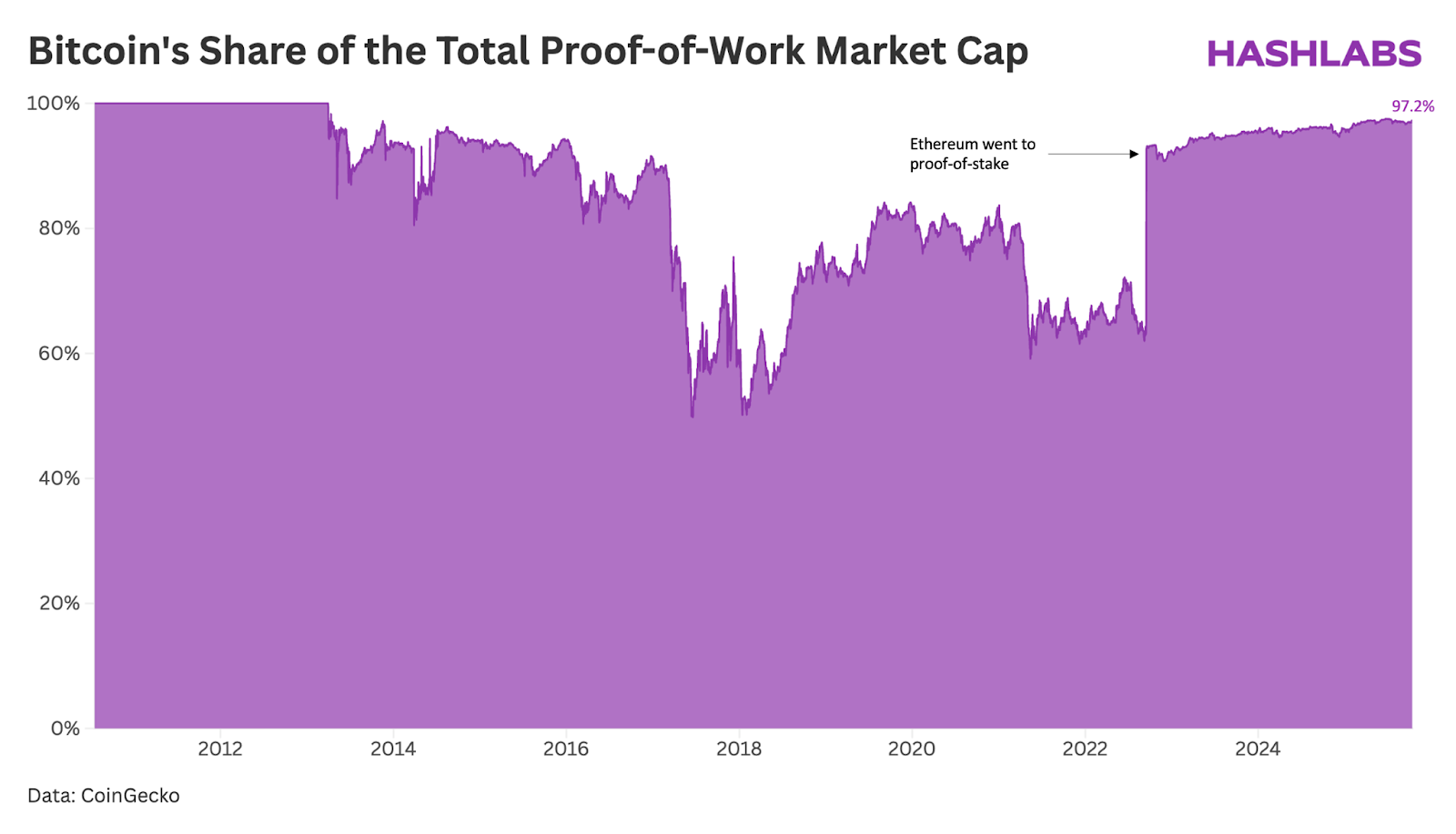 After Ethereum moved to Proof-of-Stake in 2022, Bitcoin’s share of the PoW market surged past 90%, and today it stands at 97.2%. Every year, Bitcoin’s share rises while the rest of the PoW coins stagnate or shrink.
