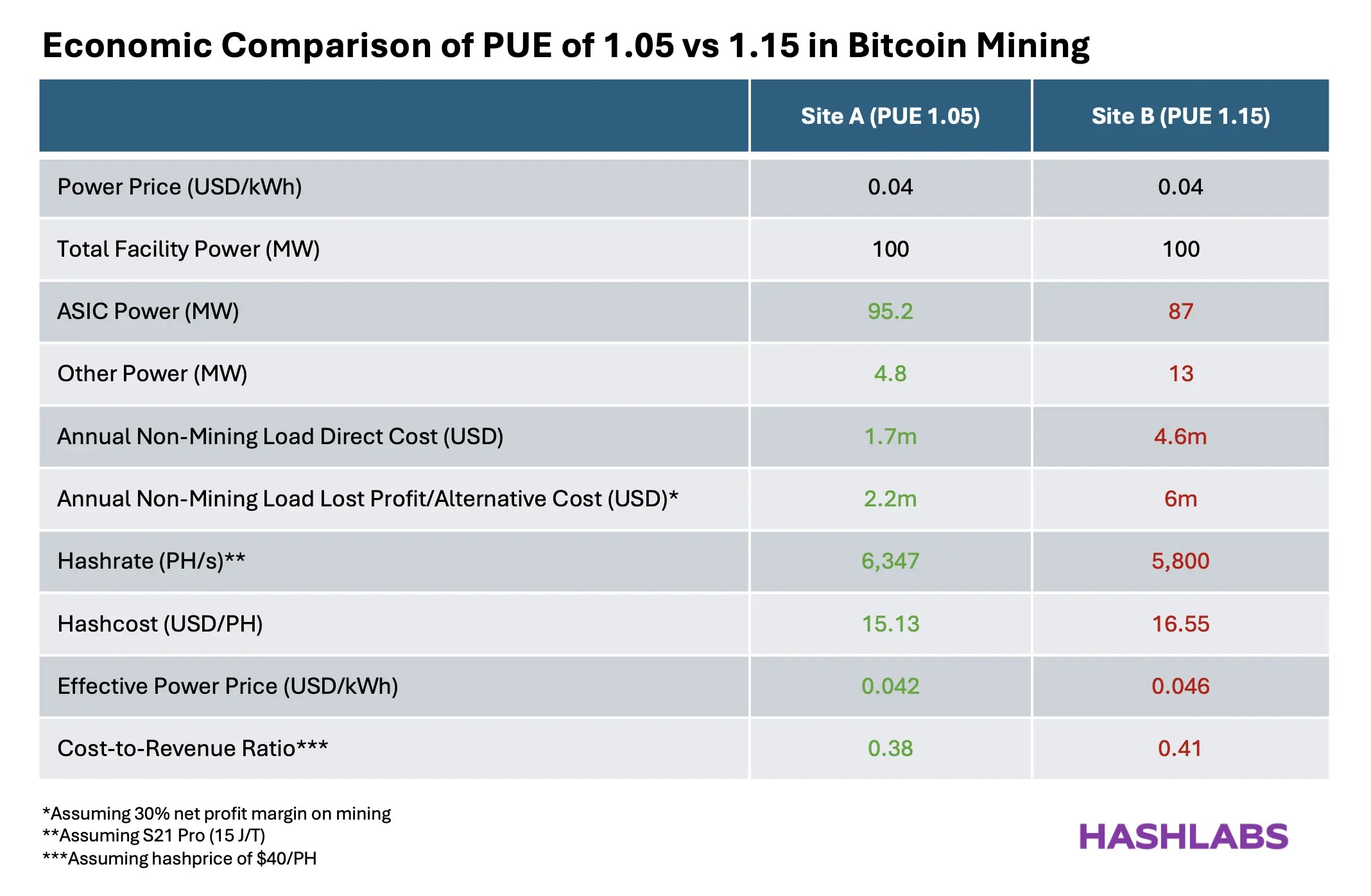With a PUE of 1.15, Site B allocates only ~87 MW to mining, with the remaining 13 MW consumed by cooling, losses, and auxiliary loads.