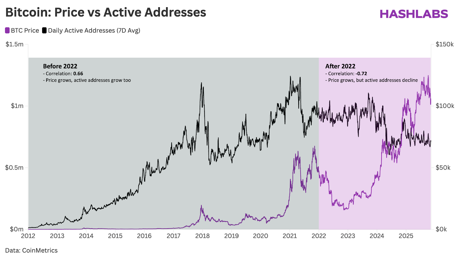 As the chart below illustrates, before 2022, rising prices pulled more users onto the base chain. That relationship has flipped. Since 2022, the Bitcoin price has risen while active address count has fallen.